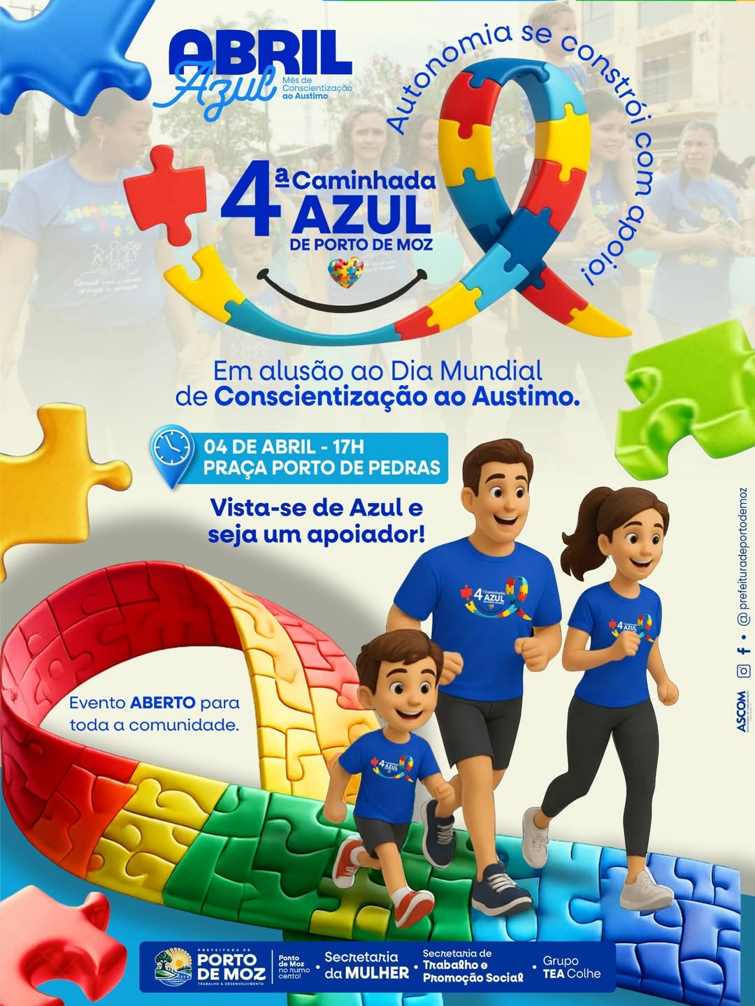 Em alusão ao Dia Mundial de Conscientização do Autismo, convidamos toda a comunidade portomozense a participar da 4ª Caminhada Azul, um momento de conscientização, respeito, acolhimento e apoio às pessoas com TEA e suas famílias.