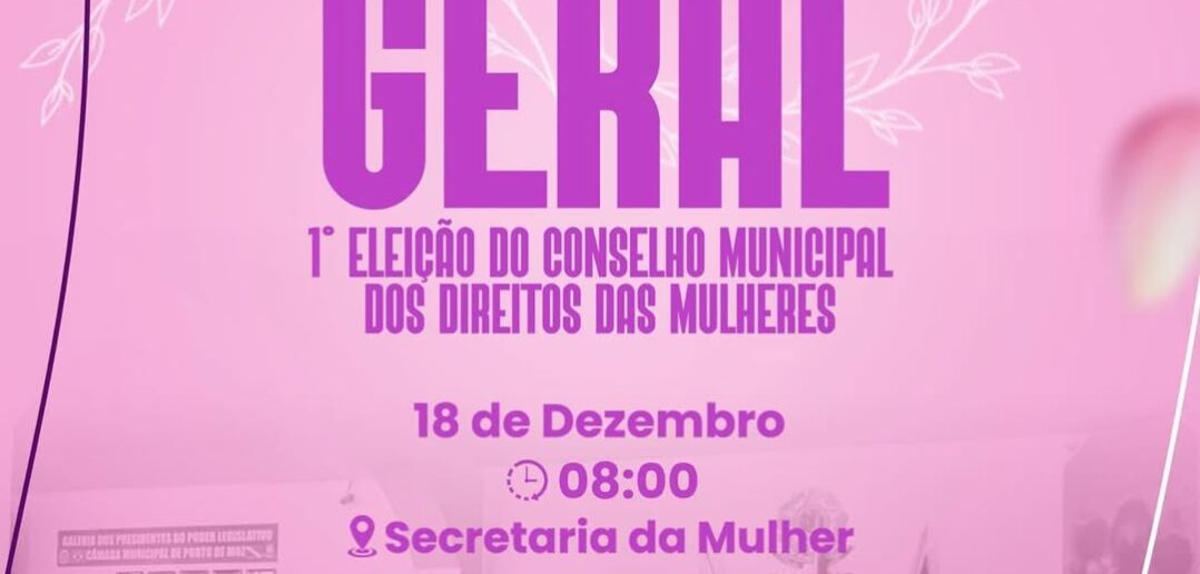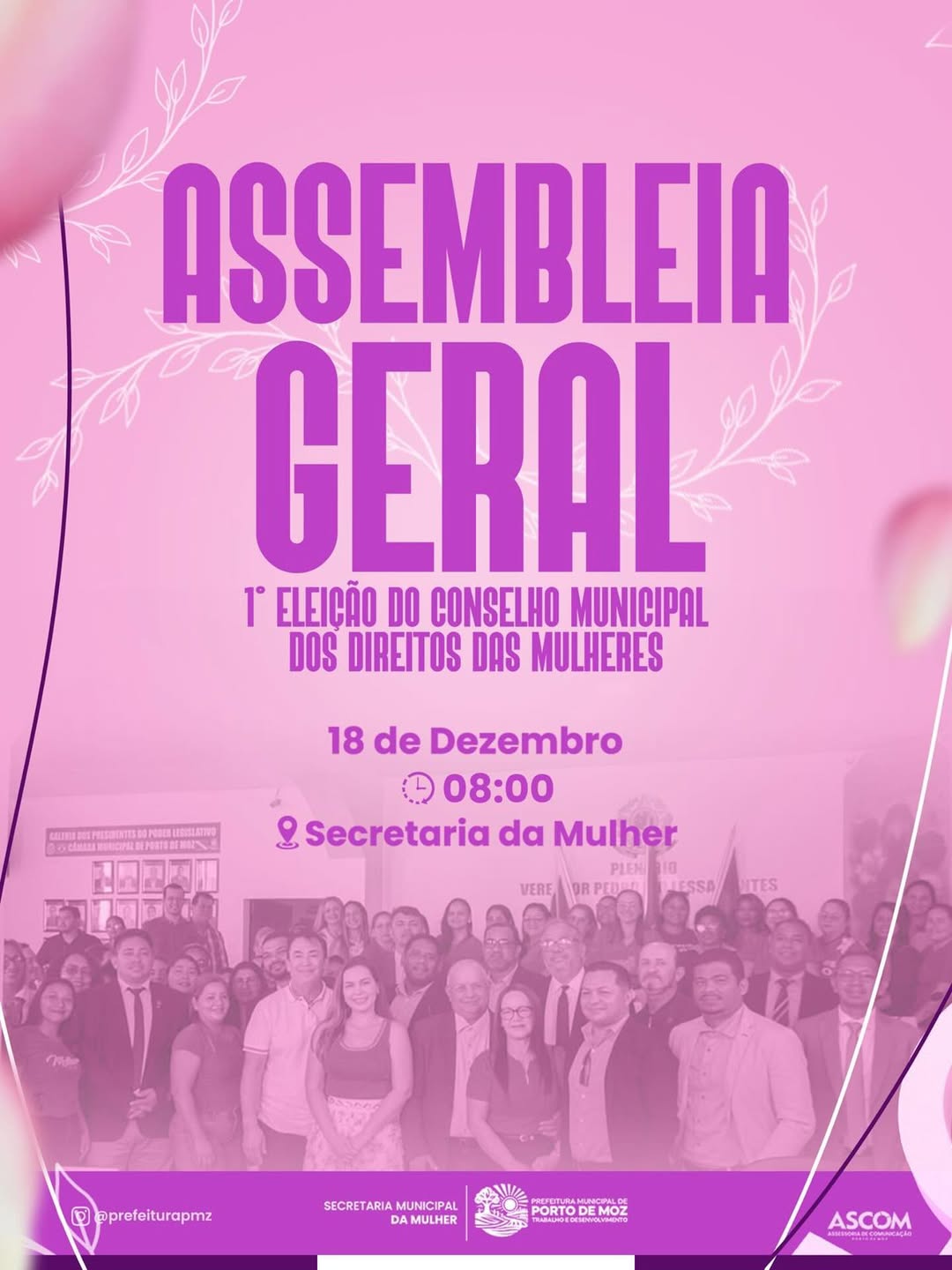 A Prefeitura Municipal de Porto de Moz, através da Secretaria Municipal da Mulher, convida toda a sociedade para participar da Assembleia Geral da 1ª Eleição do Conselho Municipal dos Direitos das Mulheres, um momento histórico de participação, cidadania e fortalecimento das políticas públicas para as mulheres do nosso município.