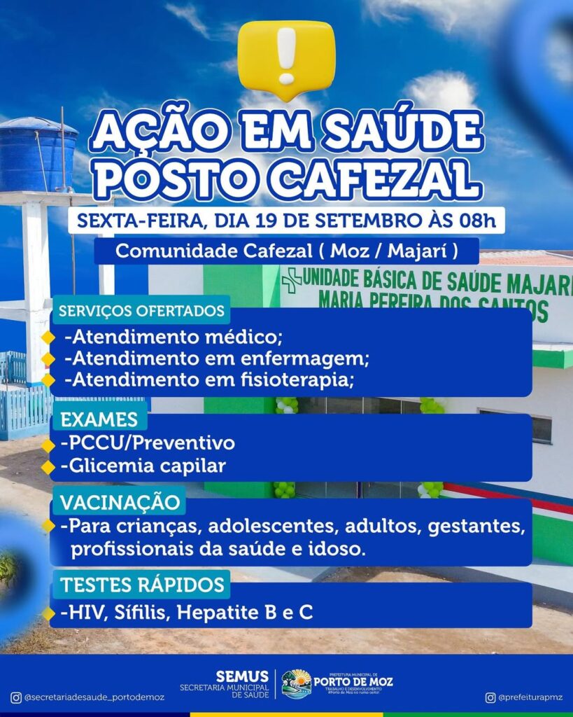 Nesta sexta-feira, 19 de setembro, a partir das 08h, a Secretaria Municipal de Saúde realizará uma grande ação de saúde no Posto de Saúde da Comunidade Cafezal (Moz/Majarí).