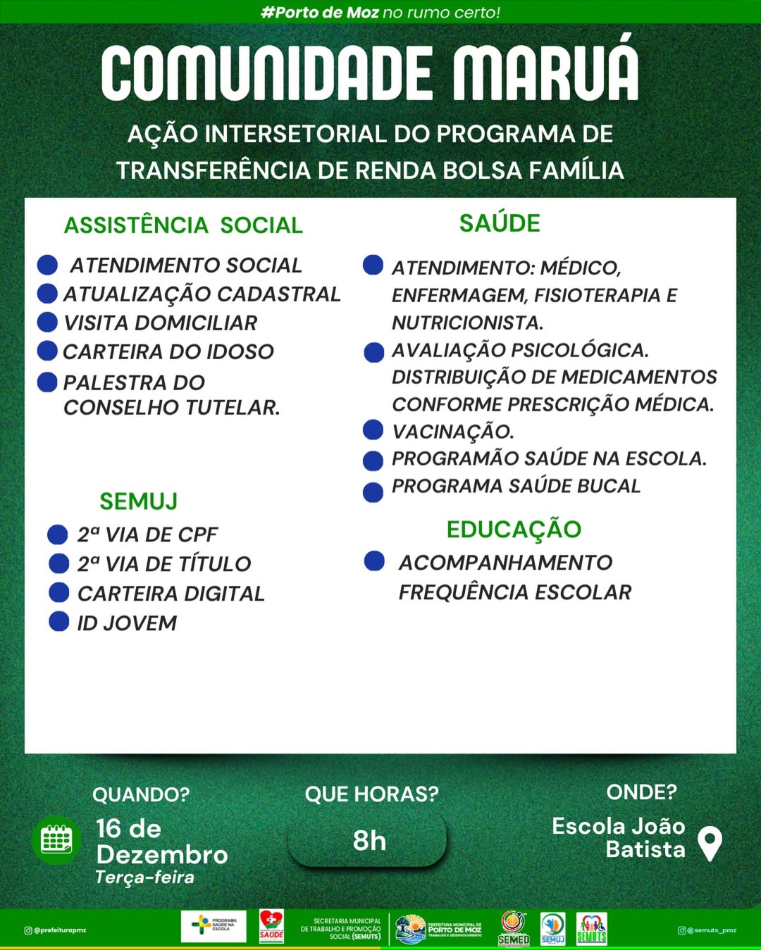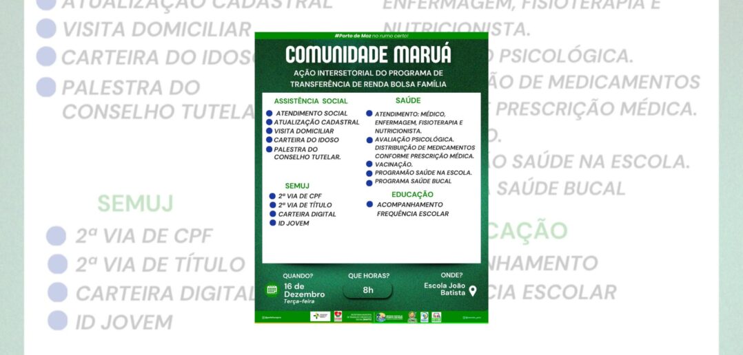 A Prefeitura Municipal realizará mais uma ação intersetorial, desta vez na comunidade do Maruá, levando serviços essenciais de saúde, educação e assistência social para mais perto da população.