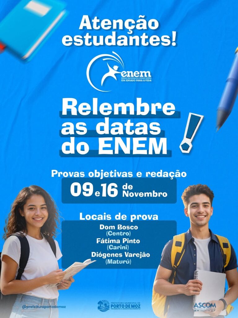 A Prefeitura Municipal de Porto de Moz reforça o lembrete para todos os participantes do ENEM 2025: as provas objetivas e de redação acontecem nos dias 09 e 16 de novembro.