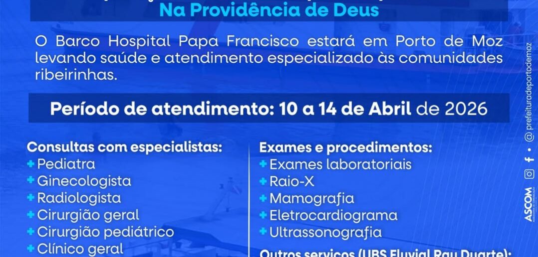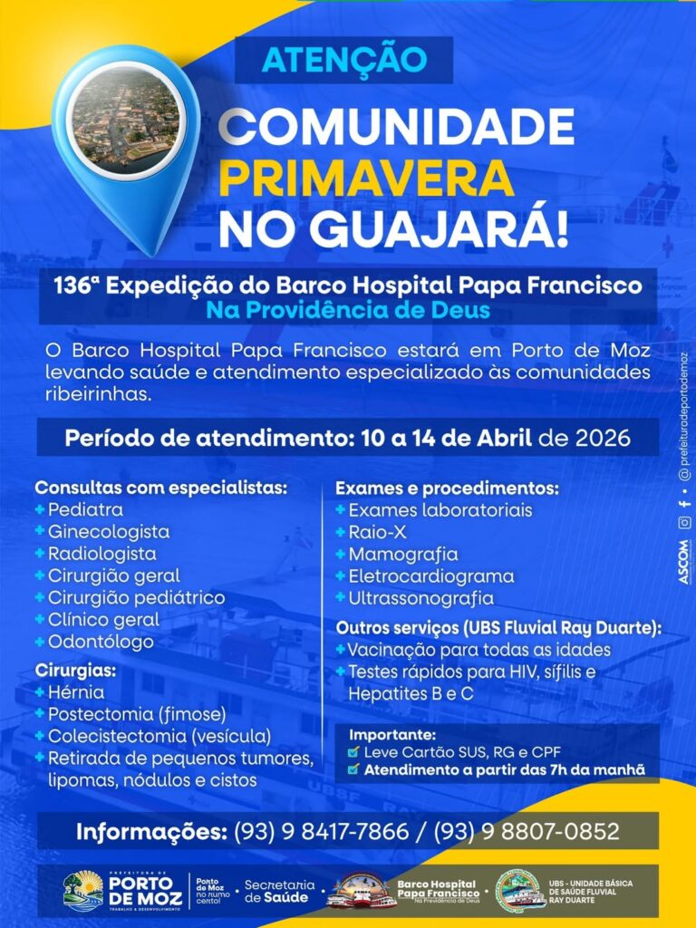 A Prefeitura de Porto de Moz, por meio da Secretaria Municipal de Saúde, em parceria com o Barco Hospital Papa Francisco, realizará uma grande ação de saúde na comunidade Primavera, no Guajará, entre os dias 10 e 14 de abril.