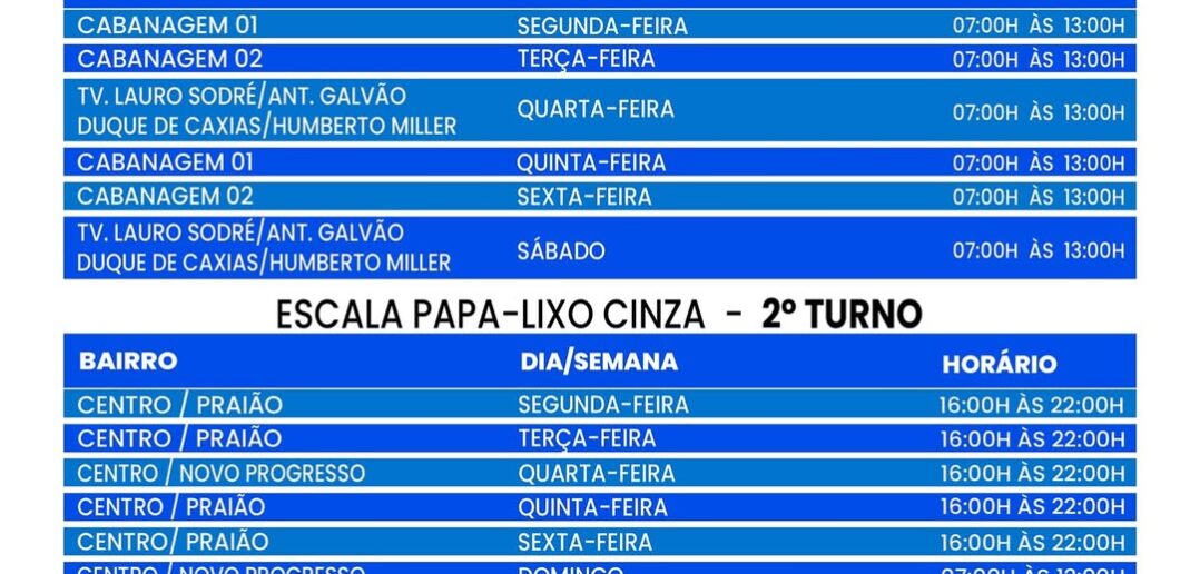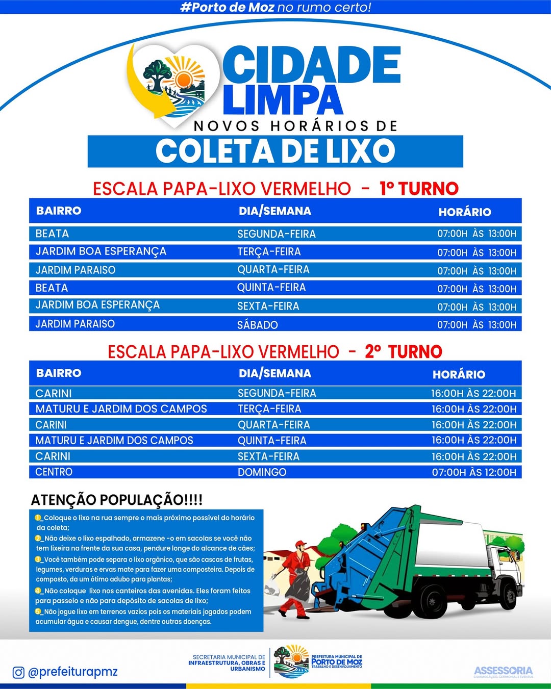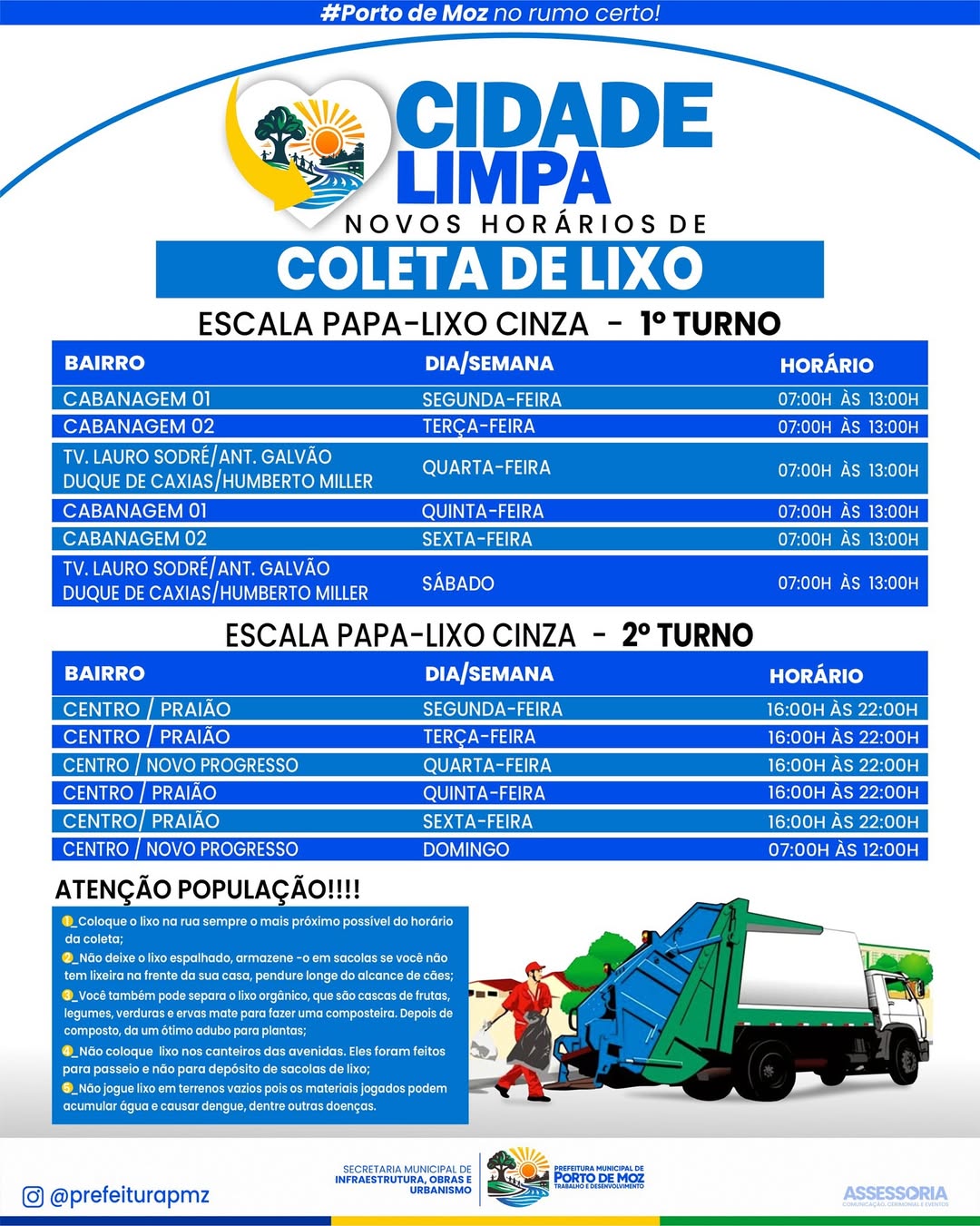 A Prefeitura de Porto de Moz, por meio da Secretaria de Infraestrutura, Obras e Urbanismo, informa os novos horários da coleta de lixo em diferentes bairros do município.