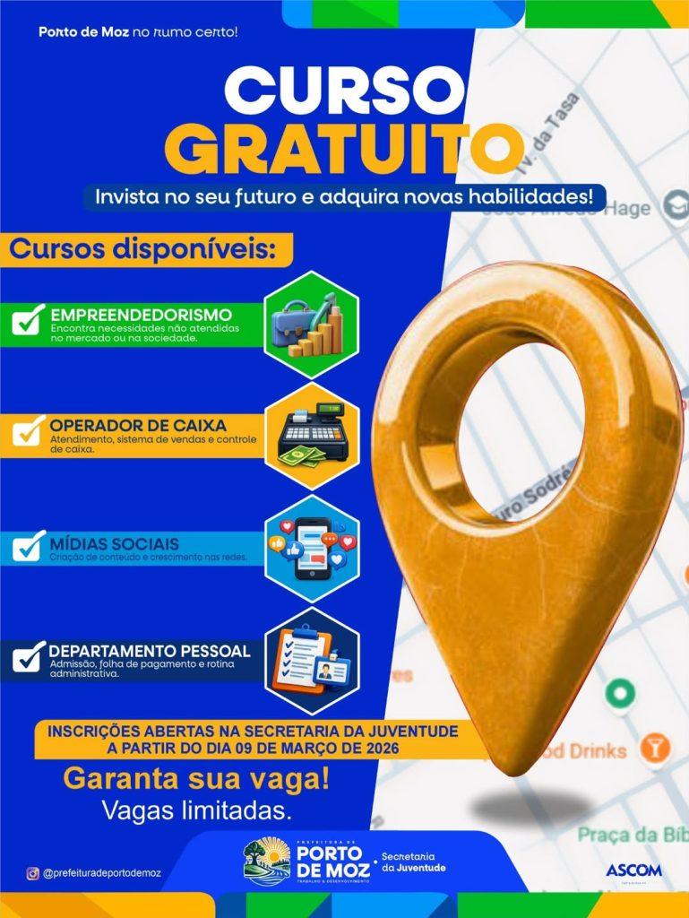 A Prefeitura de Porto de Moz, por meio da Secretaria da Juventude, está oferecendo cursos gratuitos para quem deseja aprender, se qualificar e conquistar novas oportunidades no mercado de trabalho.