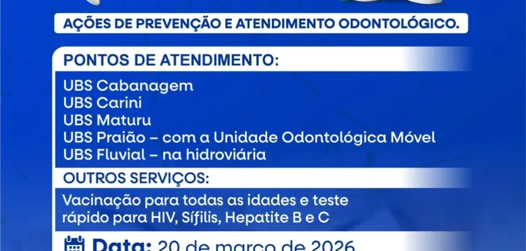 Durante a ação, a população terá acesso a orientações sobre higiene bucal, atendimento odontológico, vacinação e testes rápidos.
