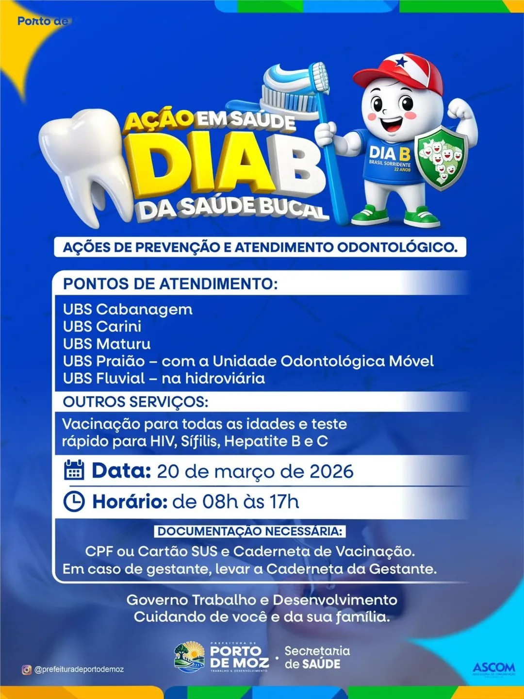 Nesta sexta-feira, 20 de março, a Prefeitura de Porto de Moz, através da Secretaria de Saúde realizará o Dia B da Saúde Bucal, com ações de prevenção e atendimento odontológico.