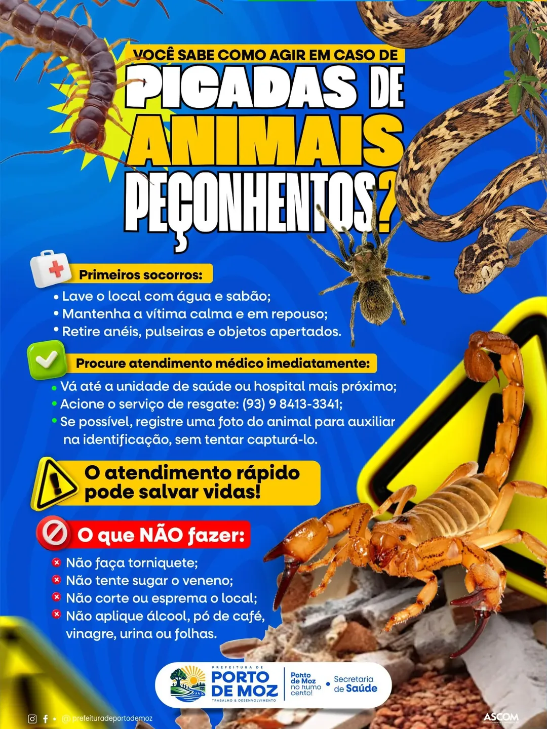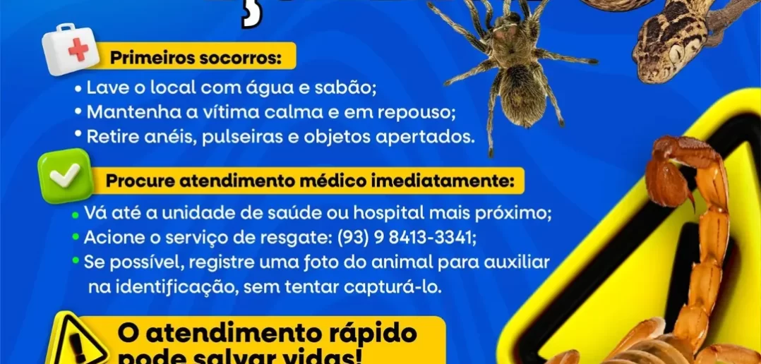 A Prefeitura Municipal de Porto de Moz, por meio da Secretaria Municipal de Saúde, orienta a população a procurar atendimento médico imediato diante de acidentes com Escorpião, Aranha, Cobra e outros animais peçonhentos.