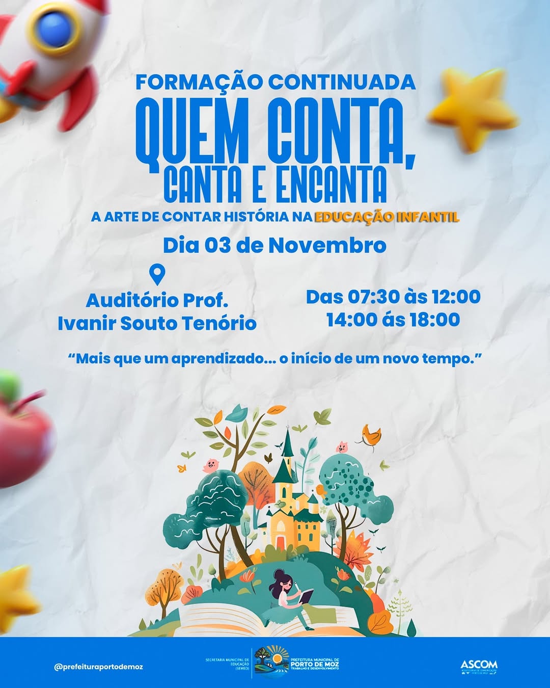 A Prefeitura de Porto de Moz, por meio da Secretaria Municipal de Educação, realiza no dia 03 de novembro a formação continuada “Quem Conta, Canta e Encanta – A arte de contar história na Educação Infantil”.