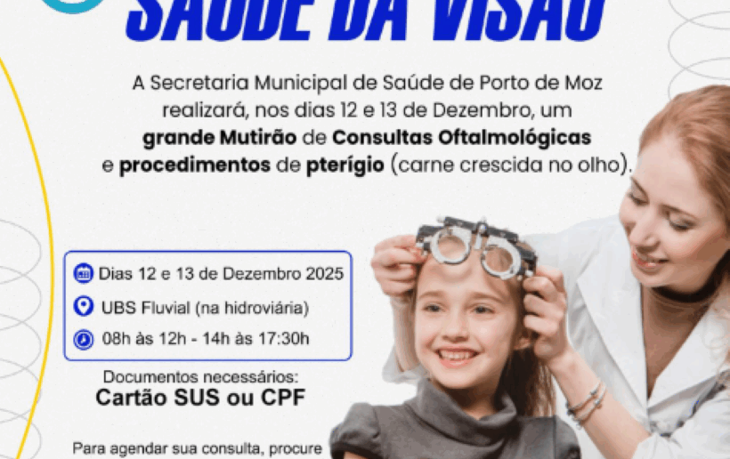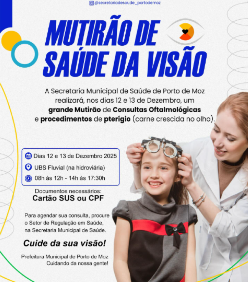 A Prefeitura Municipal de Porto de Moz, por meio da Secretaria Municipal de Saúde, realizará nos dias *12 e 13 de dezembro* mais um grande *Mutirão de Consultas Oftalmológicas e procedimentos de pterígio (carne crescida no olho).*