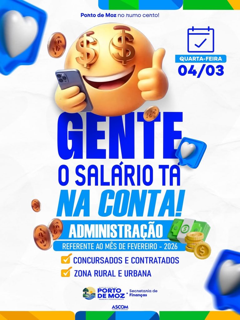 A Prefeitura de Porto de Moz, por meio da Secretaria Municipal de Finanças, informa que o pagamento da Administração, referente ao mês de fevereiro/2026, já está disponível.