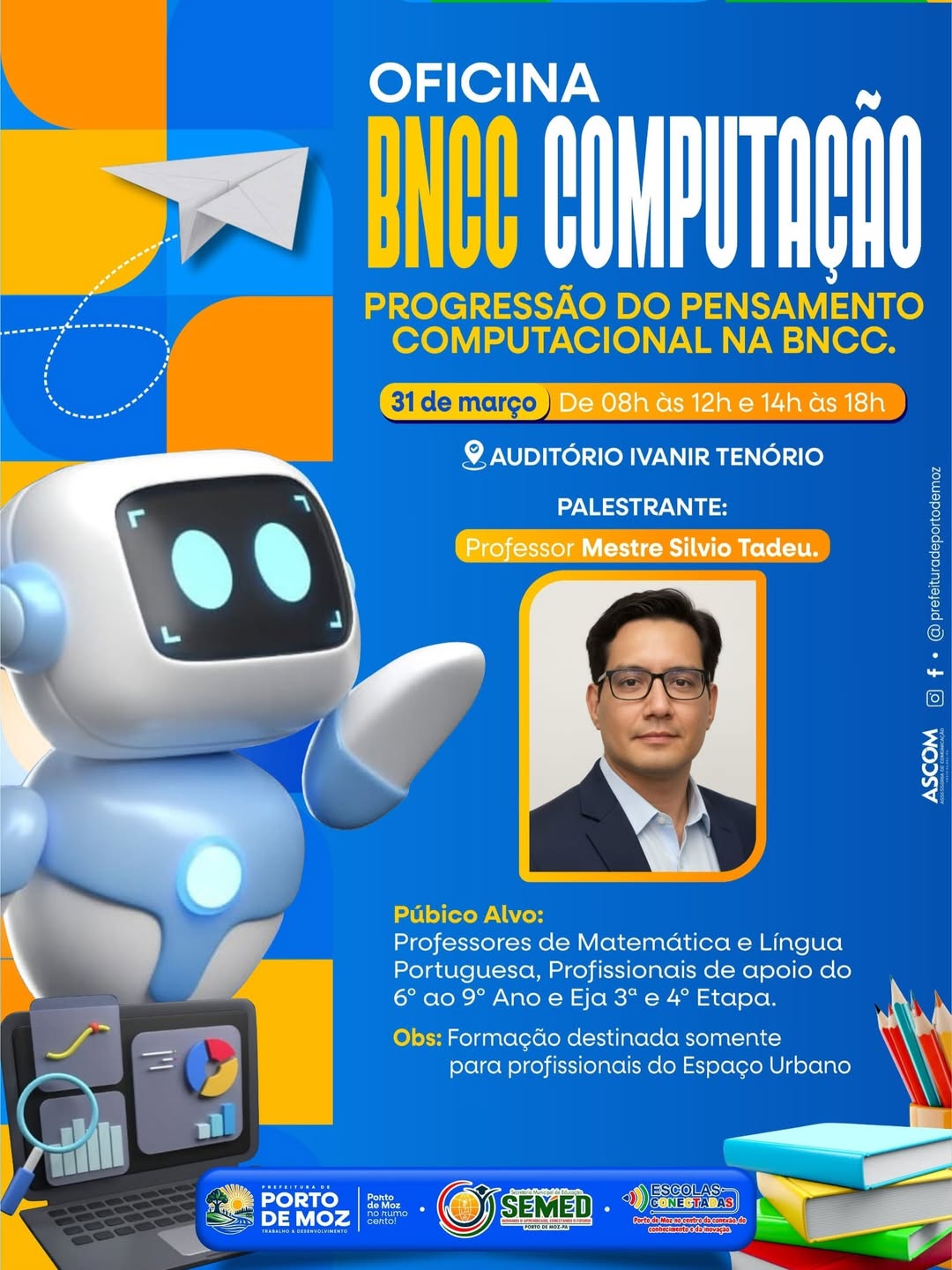 A oficina será conduzida pelo Professor Mestre Silvio Tadeu e destinada a professores de Matemática, Língua Portuguesa, profissionais de apoio do 6º ao 9º ano e EJA 3ª e 4ª etapa do espaço urbano.