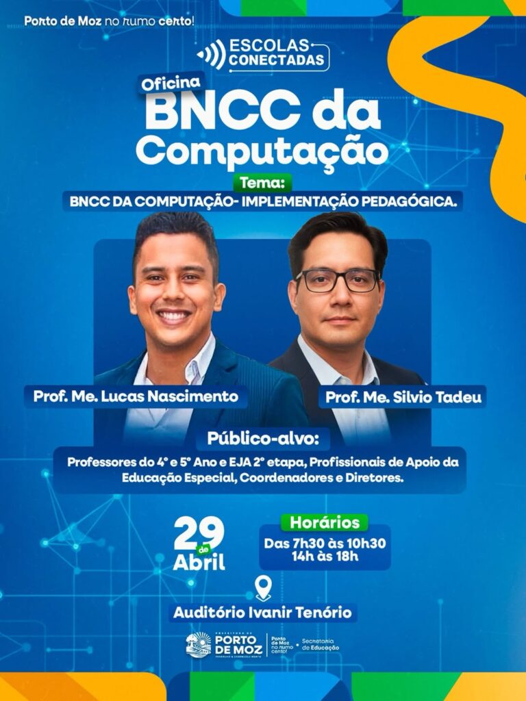 A Prefeitura de Porto de Moz, por meio da Secretaria Municipal de Educação e do programa Escolas Conectadas, convida para a Oficina BNCC da Computação. O encontro terá como tema central a implementação pedagógica, buscando inovar as práticas em sala de aula.