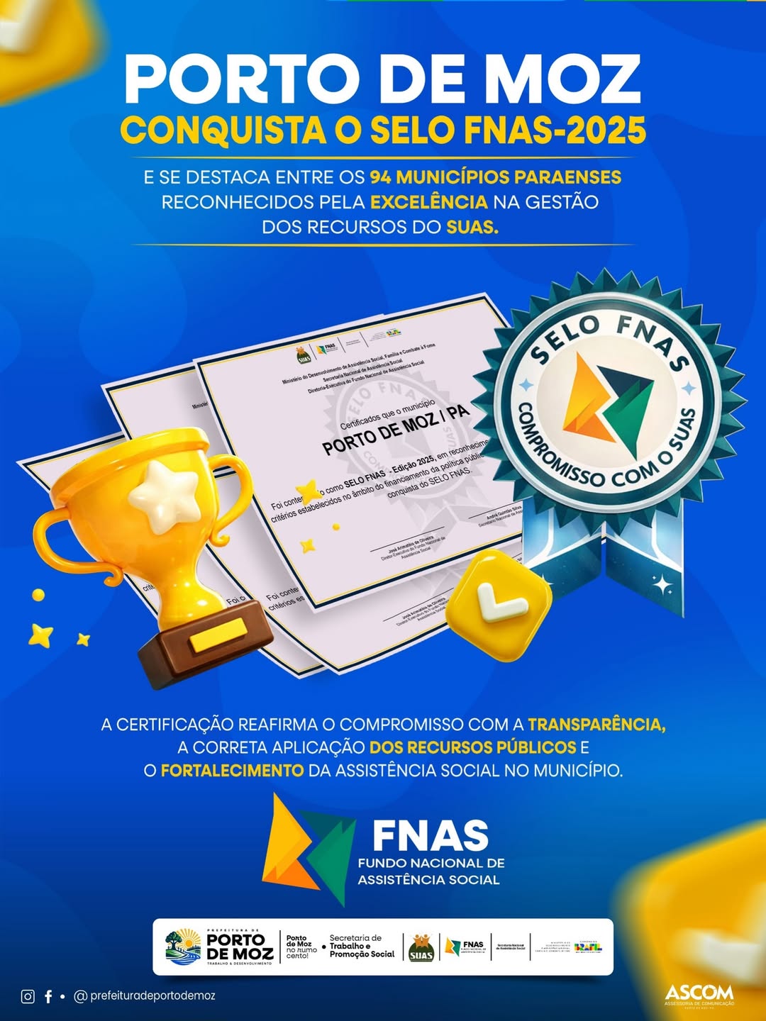 Porto de Moz está entre os 94 municípios paraenses contemplados com o Selo FNAS, dentre os 144 municípios do estado, conquista que evidencia a excelência na gestão orçamentária, financeira e contábil dos recursos do SUAS no município.