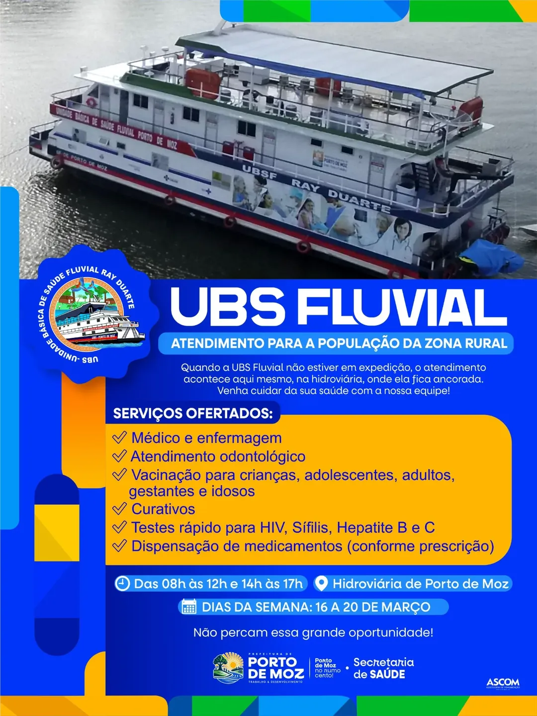 Informamos que a UBS Fluvial Ray Duarte continua realizando atendimentos na Hidroviária de Porto de Moz, especialmente para a população ribeirinha que vem à sede do município.